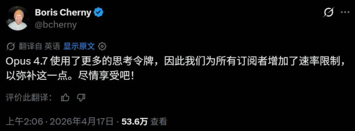 可见 SWE-bench Pro 的分数达到了 64.3%,远高于 GPT-5.4 的 57.7%。 Opus 4.7 已在所有 Claude 产品和 API、Amazon Bedrock、Google Cloud 的 Vertex AI 以及 Microsoft Foundry 平台上推出。定价与 Opus 4.6 相同:每百万个输入 token 5 美元,每百万个输出 token 25 美元。开发者可通过 Claude API 使用。 根据目前大家的使用反馈,新模型更加严谨,复杂任务的一致性也更强了,在最困难的编程任务上进步明显。当然这也不是没有代价的: