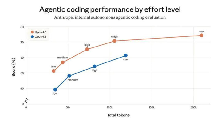 用户可以通过多种方式控制 token 的使用:例如使用工作量参数、调整任务预算或引导模型简化代码。在 Anthropic 自己的测试中,最终效果是积极的 —— 内部编码评估显示,所有工作量级别的令牌使用率均有所提高(如下所示)—— 但 Anthropic 建议在实际流量上进行评估。 Anthropic 还编写了迁移指南(https://platform.claude.com/docs/en/about-claude/models/migration-guide#migrating-to-claude-opus-4-7),提供了从 Opus 4.6 升级到 Opus 4.7 的更多建议。