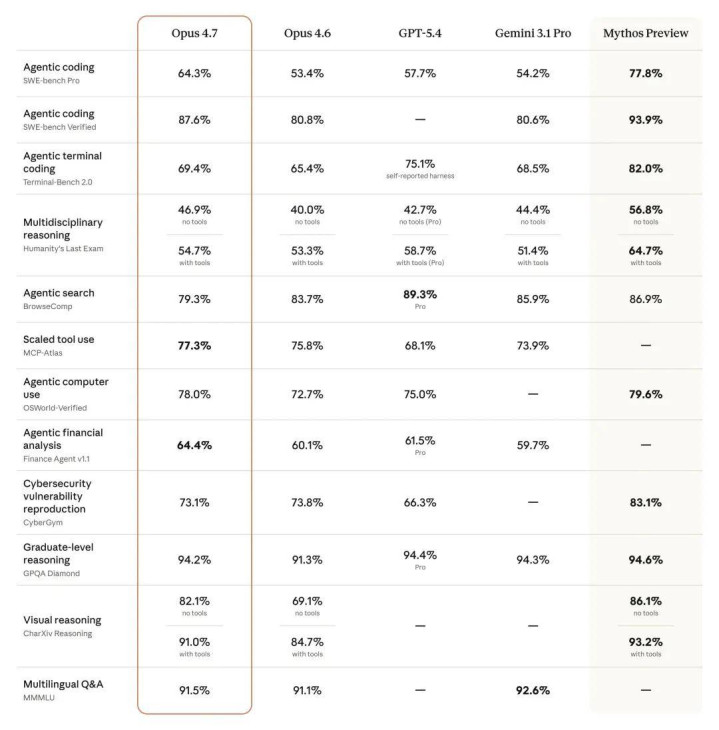 机器之心编辑部 想不到,风口浪尖上的 Claude 又大更新了。 周四晚间,Anthropic 宣布旗下最新款基础模型 Claude Opus 4.7 全面上市。 Opus 4.7 在高级软件工程方面相比 Opus 4.6 有了显著提升,尤其是在处理最复杂的任务方面。用户反馈表示,他们现在可以放心地将以前需要密切监督的最棘手的编码工作交给 Opus 4.7 处理。Opus 4.7 能够严谨且一致地处理复杂、耗时的任务,精准地执行指令,并在返回结果之前设计出验证自身输出的方法。 该模型还拥有明显更佳的视觉效果:它能够识别更高分辨率的图像,完成专业任务时,更具品味和创造力,能够制作出更高质量的界面、幻灯片和文档。而且,尽管它的功能不如刚公布的最强模型 Claude Mythos Preview 全面,但在多项基准测试中,它的表现都优于 Opus 4.6: