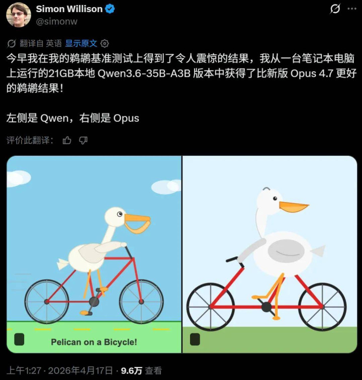 根据每个工作量级别下 token 使用情况,对内部智能编码评估进行评分。在此评估中,模型在单个用户提示下自主运行,因此结果可能无法代表交互式编码中的 token 使用情况。 在 Opus 4.7 发布后,人们开始大规模测试评价,大多数使用者认为新模型效果不错,也有人表示其 token 消耗非常惊人(pro 问两三个问题就没额度了)。 同样是在昨天晚上,千问开源了 Qwen3.6-35B-A3B(350 亿参数,激活 30 亿),有人还表示,在自己 MacBook Pro M5 上通过 LM Studio(以及 llm-lmstudio 插件)运行的千问模型生成「鹈鹕骑自行车」效果要比 Opus 4.7 好。